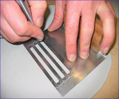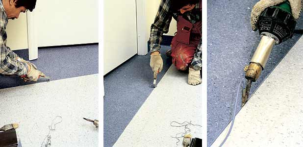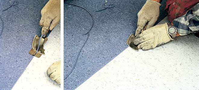 Первое действие, которое необходимо выполнить при горячей спайке покрытий - прорезание канавки для укладки шнура. Для этого места стыков напольного покрытия прорезаем специальным ножом на 2/3 толщины покрытия.