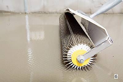 Для подготовки выравнивающей массы используем миксера. После заливки, распределяем массу на основании, при помощи ракли и удаляем воздух специальным деаэрационным (игольчатым) валиком.
