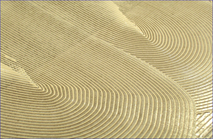 При помощи соответствующего зубчатого шпателя, распределяем клей по всему, обозначенными необходимыми границами, основанию.