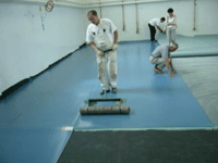 После предварительного "испарения клея" (время подсушки), раскладываем покрытие на основании четко стык в стык, без зазоров, либо с нахлестом, для более качественной прирезки швов покрытия, и затем при помощи металлических вальцов (мин. 50 кг.) прокатываем покрытие, и таким образом мы избавляемся от воздуха под покрытием.