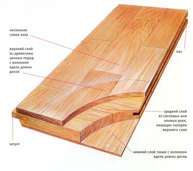 Паркетная доска – натуральное напольное покрытие, экологически чистое, простое в монтаже, готовое к использованию. Паркетная доска, как правило, трёхслойная. Нижний слой паркетной доски состоит из цельного соснового шпона толщиной 2-3 мм, который выполняет функцию противовеса, стабилизирующего геометрию доски. Средняя часть (сердцевина) паркетной доски состоит из наборного соснового массива, расположенного перпендикулярно направлению рабочего верхнего слоя в целях компенсации общего внутреннего собственного напряжения, а так же на среднем слое изготавливается профиль соединения. Это может быть клеевое соединение типа шип-паз или бесклеевое, замковое соединение, которое расположено по всей продольной и поперечной части паркетной доски. Верхняя, рабочая часть паркетной доски состоит из натурального шпона ценных пород древесины толщиной 4-5 мм. Поверхность этого шпона отциклевана, отшлифована и покрыта семью слоями полиуретанового паркетного лака, который в свою очередь подвергается лазерной закалке, в целях повышения износостойкости поверхности. Паркетная доска подкупает своей натуральностью. Не существует двух совершенно одинаковых, похожих по рисунку поверхности досок, как и древесных срезов. В каком бы месте ствола древесины ценных пород Вы не делали срез, Вы будете получать новый не похожий на предыдущий по рисунку срез. Для удовлетворения спроса потребителей, заготовки для рабочего шпона изготавливаются путём продольного или поперечного среза ствола ценных пород древесины, что влияет на рисунок и селекцию готового продукта. Ощутимую разницу в цене играет «полосность» и селектность (отбор) доски.
